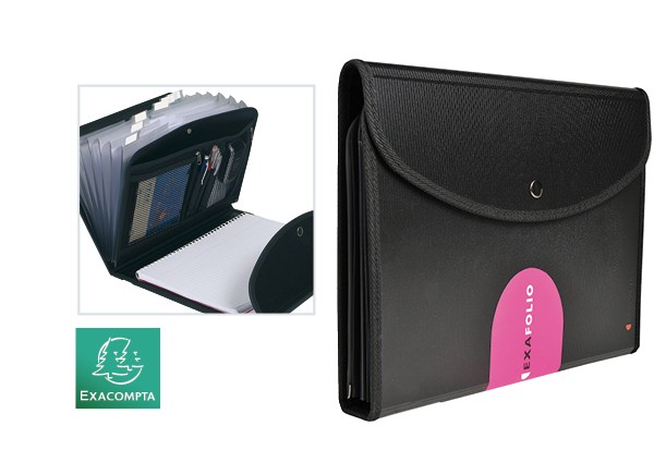 Vícedílné zakládací pouzdro. Vnitřní přihrádky na dokumenty A4 jsou opatřeny popisovatelnými záložkami pro jednoduchou identifikaci dokumentů. Pouzdro navíc obsahuje kroužkový blok A4, kapsy na drobné dokumenty, CD/DVD, vizitky, mobilní telefon nebo tablet, 3 poutka na propisky. Uzavírání patentem. Vyrobeno z extra silného (2 mm) a odlehčeného polypropylenu.
