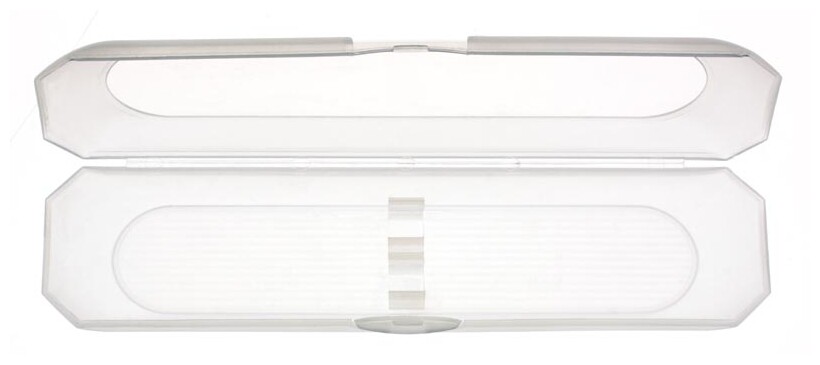pouzdro transparentní matné na 2 silnější pera. Baleno v bílé, lesklé papírové krabičce.
