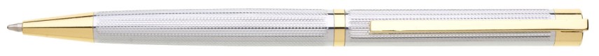 Elegantní stříbrná propiska s jemným dekorem a zlatými doplňky. V horní části je místo bez dekoru pro umístění loga. Značka Gabrielis. Otočný mechanismus, kovová velkoobsahová náplň.