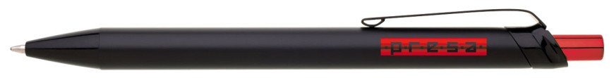 Kovová černá propiska s metalicky červeným cvakátkem. Netradiční na této propisce je laser, který je červeně lesklý. Vyniká zde zejména inverzní zpracování loga. Náplň velkoobsahová, modře píšící.