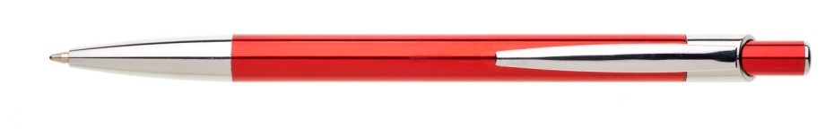 Kovová červená propiska s lesklým povrchem a charakteristickou protáhlou špičkou. Špička i klip jsou pochromované.