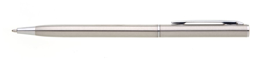 Tenká propiska s otočným mechanismem o rozměrech 130x 7,5 mm. Materiál - nerezová ocel, náplň modře píšící.