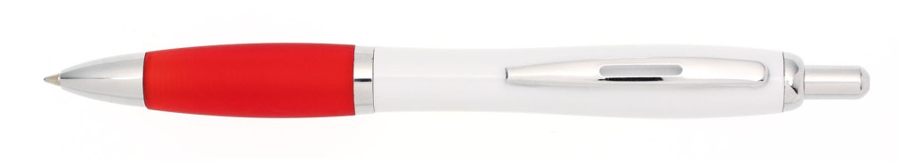 Plastové propisovací pero JESI s bílým tělem. Barva pogumovaného úchopu je červená. Ostatní doplňky jsou stříbrné. Náplň je velkoobsahová, modře píšící.