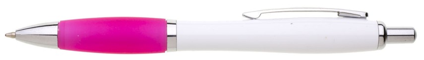 Plastové propisovací pero JESI s bílým tělem.Barva pogumovaného úchopu je růžová. Ostatní doplňky jsou stříbrné. Náplň je velkoobsahová, modře píšící.