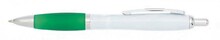 Plastové propisovací pero JESI s bílým tělem. Barva pogumovaného úchopu je zelená. Ostatní doplňky jsou stříbrné. Náplň je velkoobsahová modře píšící.
