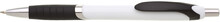 Plastová propiska s bílým tělem s černým úchopem a klipem a stříbrnými doplňky.