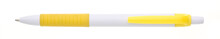 Propiska s bílým tělem, žlutým gripem a klipem, náplň modře píšící.