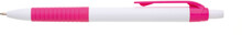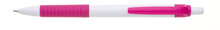 Propiska s bílým tělem, tmavě růžovým gripem a klipem, náplň modře píšící.