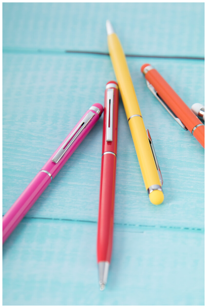 Hliníkové kuličkové a dotykové pero s modrou náplní.
