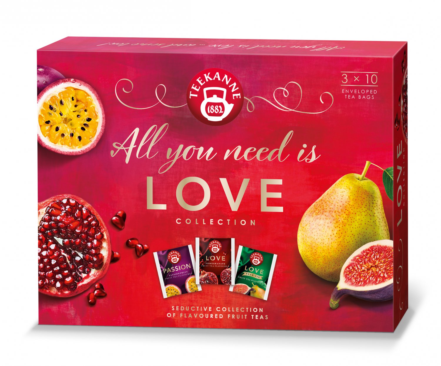 Znamenitá kolekce LOVE od TEEKANNE - ochutnejte tři výjimečně lahodné ovocno-bylinné směsi pro všechny Vaše smysly. LOVE - s příchutí granátového jablka a broskve, PASSION - s příchutí maracuji a DESIRE - s příchutí třešně v čokoládě.