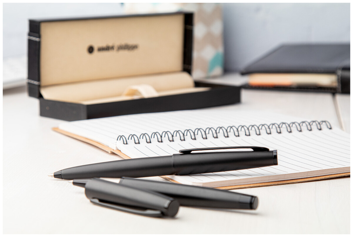 Elegantní sada kovového kuličkového pera a rolleru v matné černé úpravě. Ve speciální papírové dárkové krabičce a s modrou náplní. Značkový produkt André Philippe.