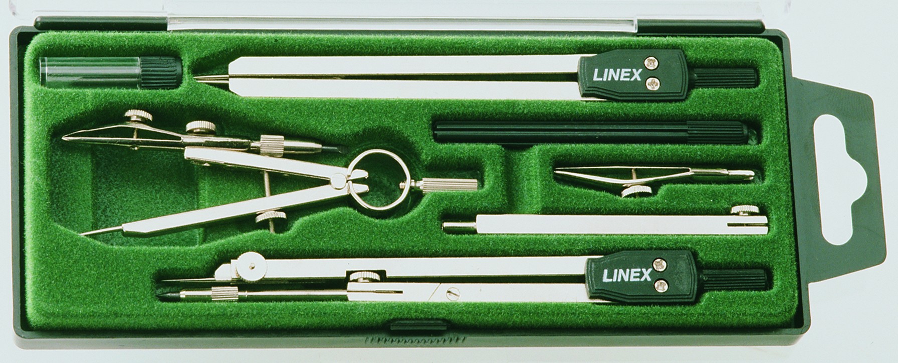 Sada - kružítko s kloubem, nulátko, nástavec, odpichovací kružítko, nástavec na tužku a příslušenství.