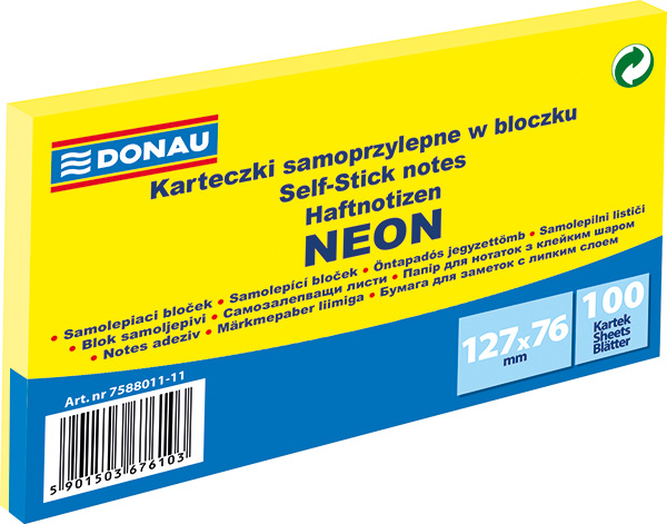 | U7588011-11 | BLOČEK SAMOLEPÍCÍ DONAU 127 x 76 mm, 100 listů, neonově žlutý | 33,26 Kč | 40,24 Kč | 1 ks | |||