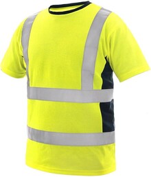 Výstražné tričko s kulatým průkrčníkem v kontrastní modré barvě, krátký rukáv, reflexní pruhy: 2 horizontální, 2 vertikální (šíře 5 cm), po stranách panely ze síťoviny v modré barvě. Doporučené použití: stavebnictví, silničáři, řidiči, logistika, údr