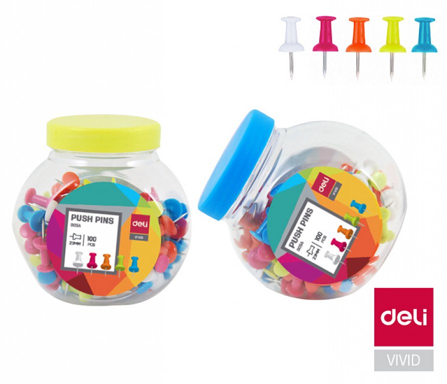 PŘIPÍNÁČKY DELI BAREVNÉ, v plastové dóze 100ks