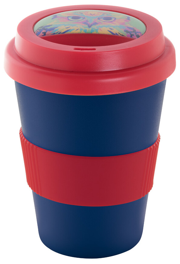 Dvoustěnný plastový termo hrnek s víčkem na pití a silikonovým úchopem na zakázku. 300 ml. Min. mn.: 50 ks.