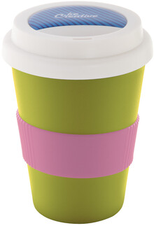Dvoustěnný plastový termo hrnek s víčkem na pití a silikonovým úchopem na zakázku. 300 ml. Min. mn.: 50 ks.