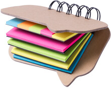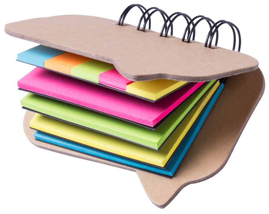 Blok s různě barevnými samolepícími lístky (100 ks 5,1x7,5 cm a 125 ks 1,5x5,1 cm), ve spirálové vazbě s deskami ve tvaru bubliny z recyklovaného papíru.