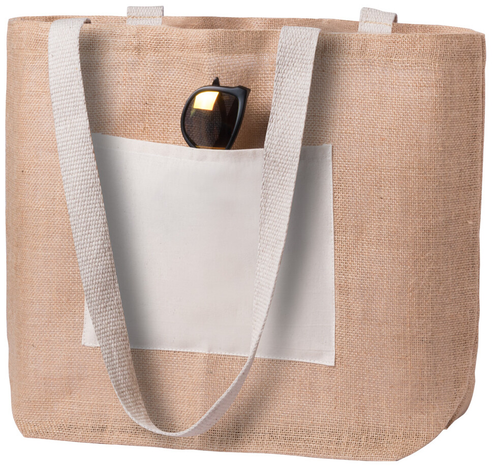 Plážová taška z juty se stejně barevnými uchy a přední kapsou.