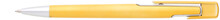 Plastová propiska GIDI s metalickým povrchem a efektním klipem ve žluté barvě, špička je stříbrná. Náplň velkoobsahová, modře píšící.