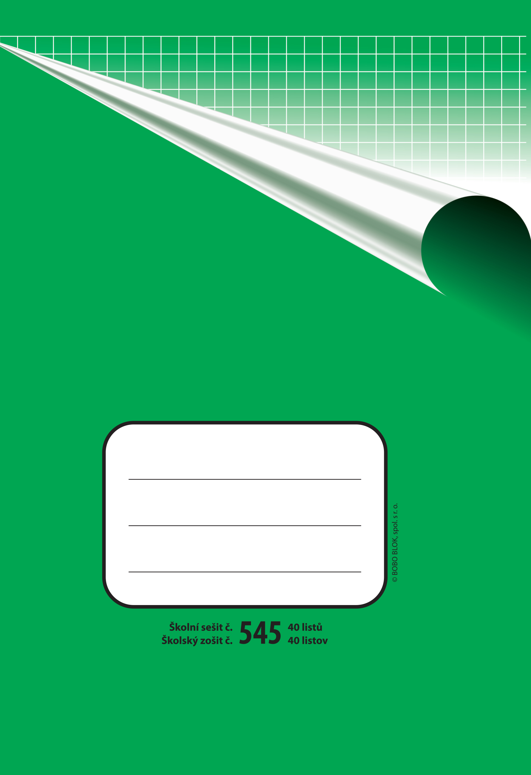 Školní sešit Bobo 545 je čtverečkovaný sešit ve formátu A5 s vyšší gramáží papíru, který zajišťuje lepší pevnost, menší průsvitnost a pohodlné psaní tužkou i perem. Praktická obálka nabízí prostor pro nadepsání jména, třídy nebo předmětu.