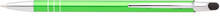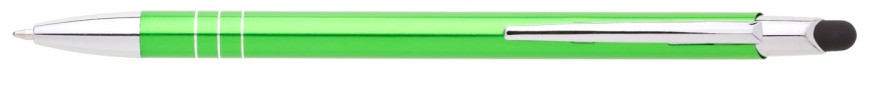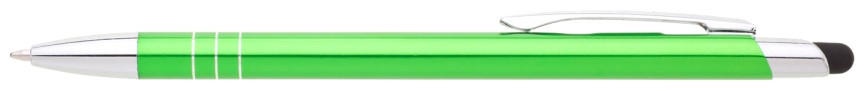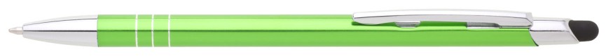 Tenká kovová propiska SOTTI s touch koncem ve světlezelené barvě s chromovými doplňky a třemi tenkými proužky. Náplň X-20, modře píšící.