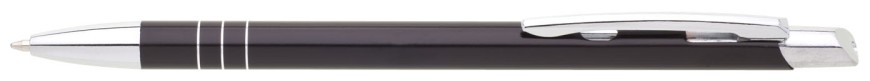 Tenká kovová propiska SOTTI v černé barvě s chromovými doplňky a třemi tenkými proužky. Náplň X-20, modře píšící.