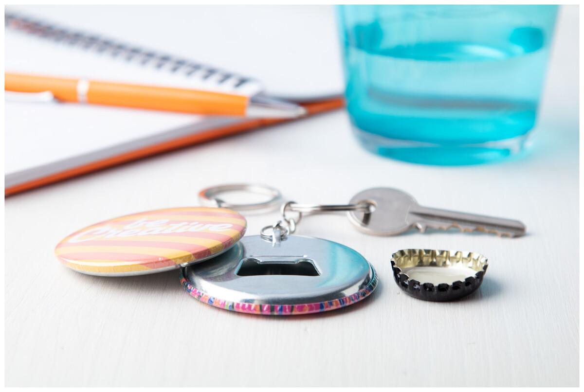 Přívěšek na klíče s velkou plackou a otvírákem na láhve s plnobarevně potištěným vloženým papírem. Cena zahrnuje digitální tisk, nezahrnuje tiskovou přípravu. Min. mn.: 100 ks.