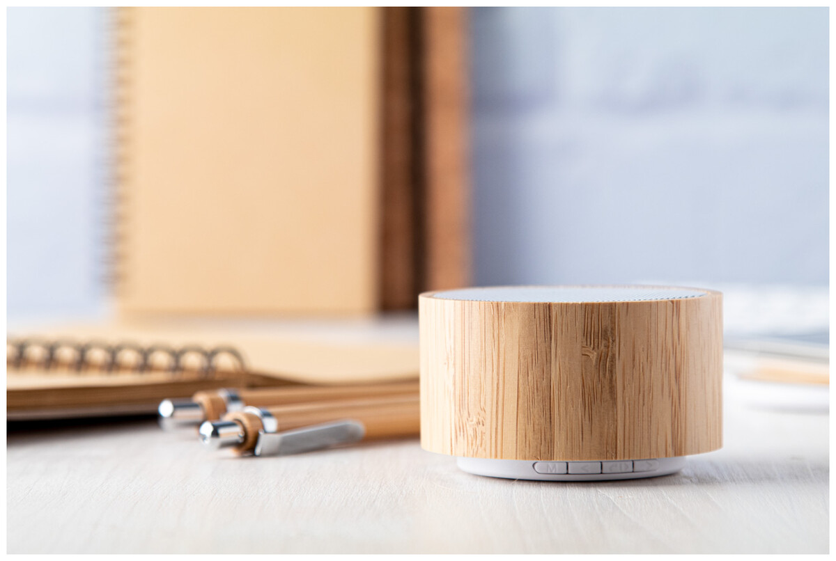 Bezdrátový reproduktor v bambusovém pouzdře s funkcí hands-free volání, FM rádiem a vestavěnou dobíjecí baterií. Včetně nabíjecího kabelu USB.