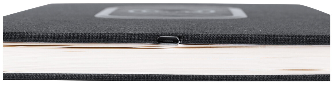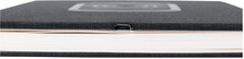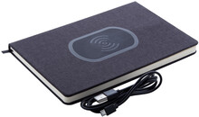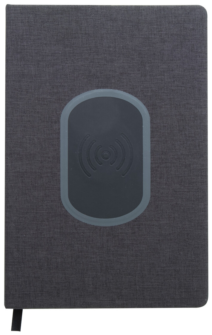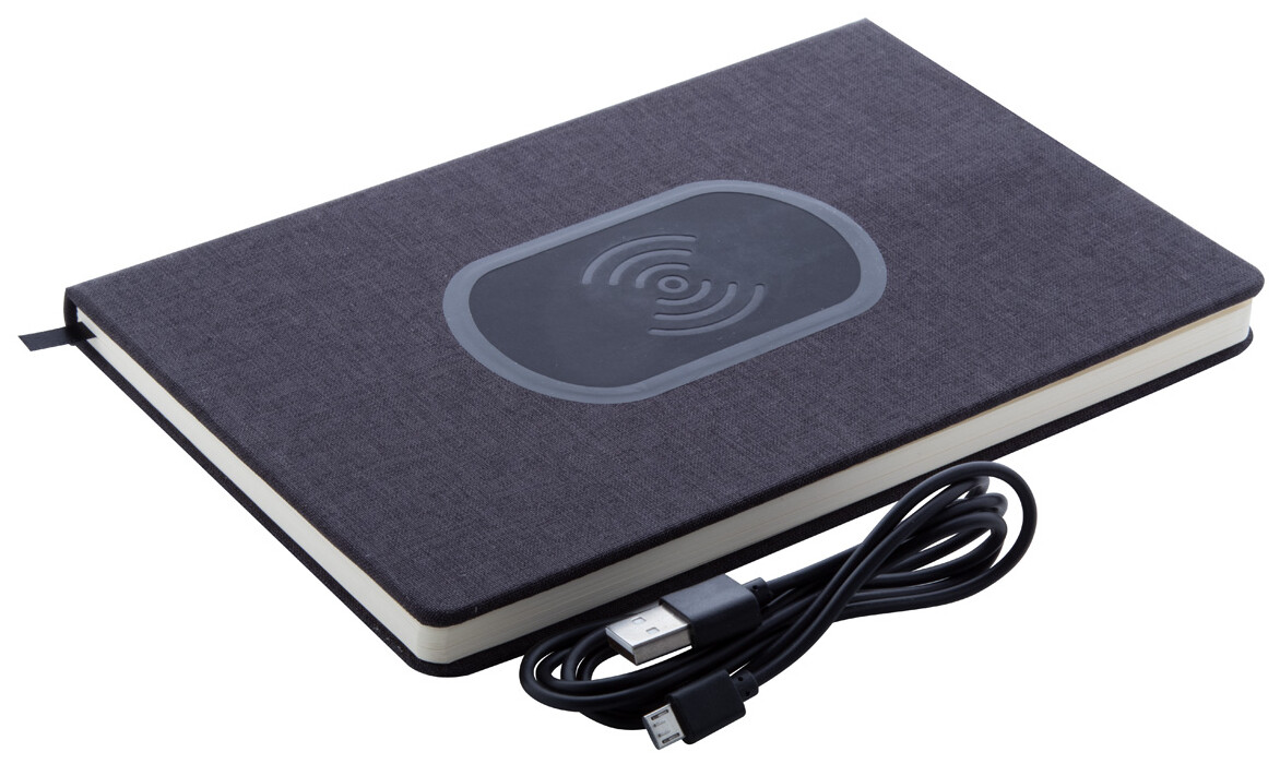 Notebook potažený 300D polyesterem s vestavěnou bezdrátovou rychlonabíječkou (15 W) a 80 linkovanými listy. Velikost A5. Včetně kabelu USB nabíječky.