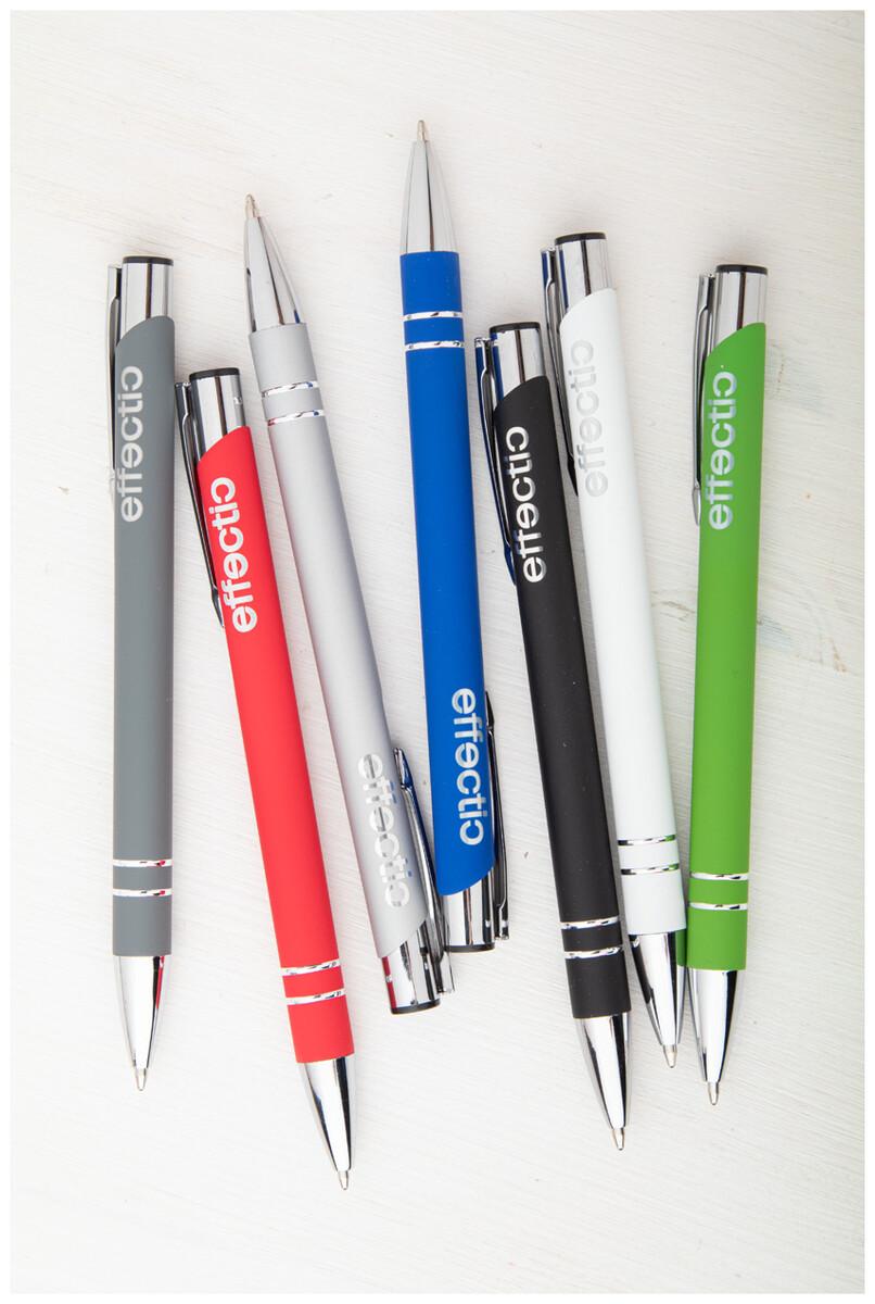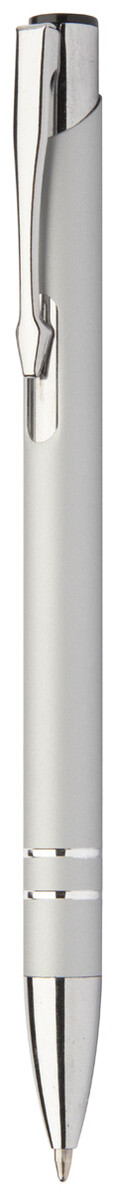 Hliníkové kuličkové pero s pogumovaným povrchem a modrou náplní. Speciální povrch pro laser stříbrného loga.
