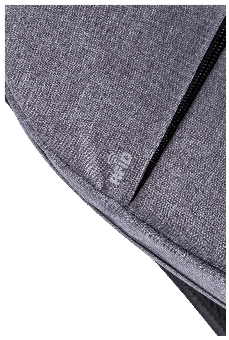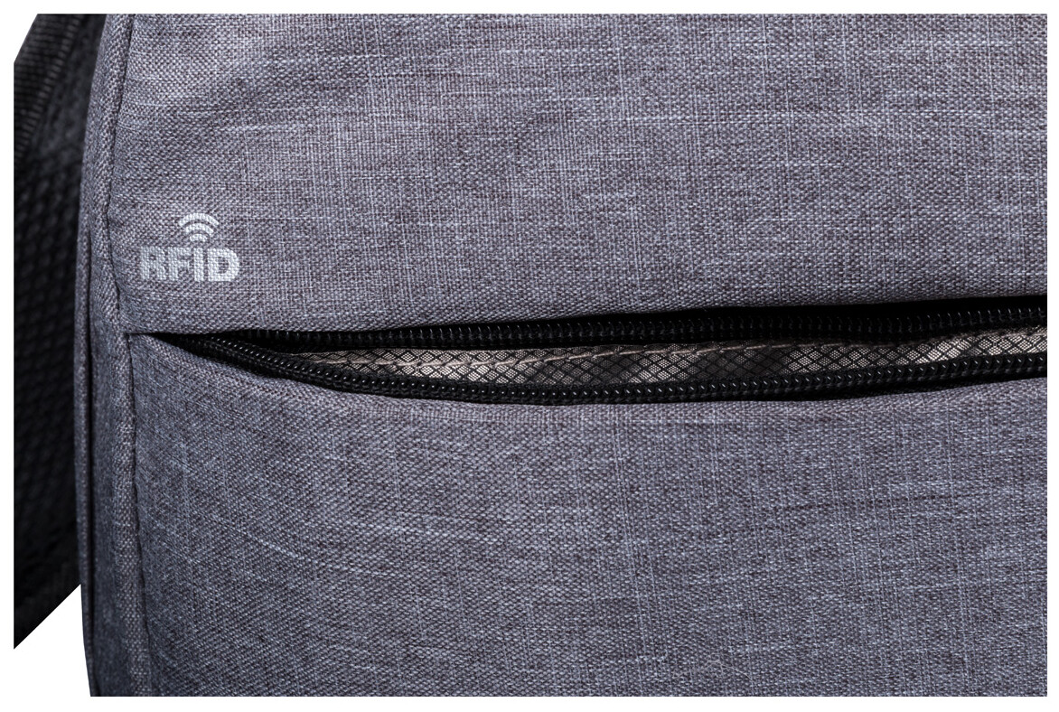 Batoh s RDFID ochranou s mnoha přihrádkami na zip, vypolstrovaným oddílem na laptop (15"), vypolstrovanými zády a ramenními popruhy. S vestavěným USB připojením pro power banku. 300D polyester.