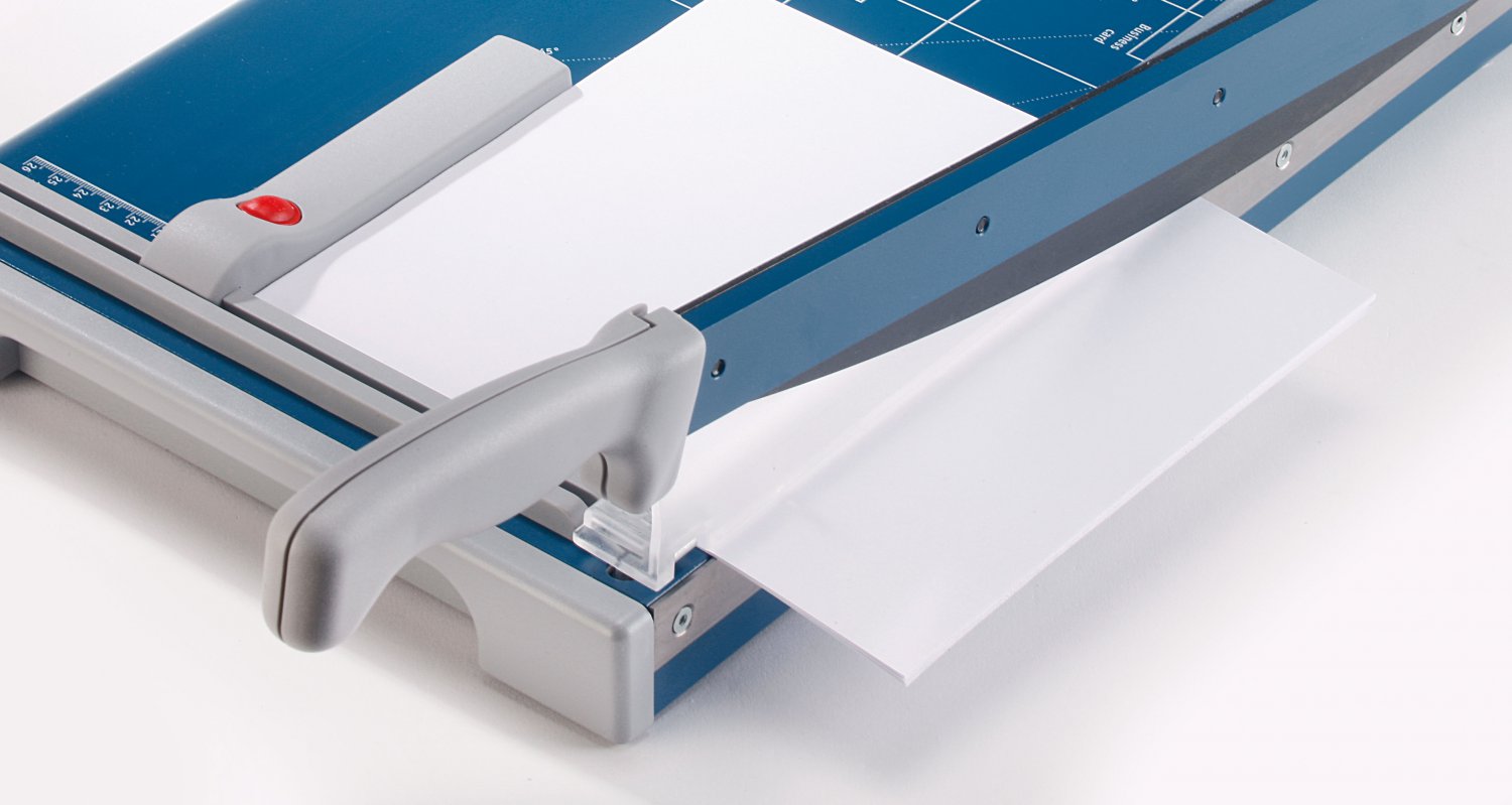 Spolehlivá páková řezačka pro kancelář i školu. Vysoce kvalitní nože Solingen - spodní ostrý nůž a horní s plochým ostřím pro bezpečnou manipulaci. Přesný řez je zaručen ocelovým zpevněním přítlačného ramene. Určeno pro více druhů materiálů: papír, karton, textil, fotografie a fólie. Stabilní kovový stůl se zaoblenými hranami a neklouzavými pryžovými patkami. Natištěné úhly a DIN formáty usnadňují přesné vyrovnání řezaného materiálu. Dva příložníky s dělením v mm a nastavitelným zadním dorazem pro fixaci řezaného materiálu a přesný řez 90°. Vyměnitelný horní nůž s plochým ostřím. Manuální přítlak s integrovanou ochranou prstů pro bezpečnou fixaci řezaného materiálu. Praktické úchyty pro přenos. Ergonomicky tvarovaná rukojeť zajistí pohodlné řezání.