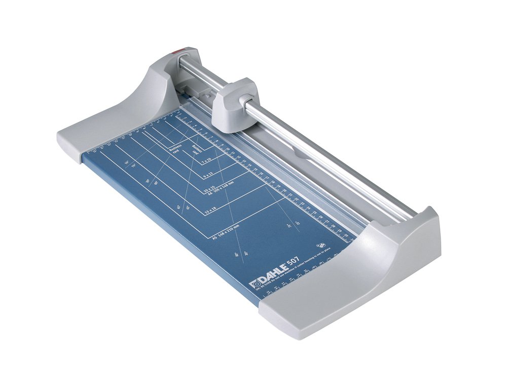 Bezpečná kotoučová řezačka pro běžné použití v kanceláři i škole. Ostrý kotoučový nůž a spodní nůž zaručují přesný řez. Uzavřená hlava nože zajišťuje vysokou míru bezpečnosti. Snadná výměna řezací hlavy. Automatický přítlak v místě řezu pro optimální fixaci řezaného materiálu. Stabilní kovový stůl s neklouzavými pryžovými podložkami pro komfortní provoz. Dva příložníky pro přesný řez 90°. Natištěné úhly a DIN formáty - užitečné formátování na stole s dělením v mm, usnadňují přesné vyrovnání řezaného materiálu. Lze dokoupit: sada kreativních nožů pro model 507 se 3 hlavami pro dekorační řezy - vlnitý, nepravidelný a perforace, náhradní řezací hlava. Váha: 1 kg. Rozměr stolu: 440 x 211 mm. Délka řezu: 320 mm. Výška řezu: 0,8 mm. DIN: A4. Řezný výkon: 8 listů papíru (80 g/m2).