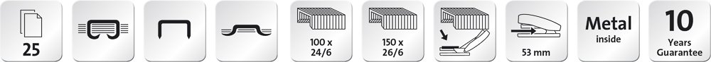Užitečná sešívačka pro každý psací stůl. Celokovová sešívačka s částečným horním plastovým krytem. Integrovaný odstraňovač sponek z plastu. Stabilní, proti skluzová spodní část. Plnění shora s jednoduchým vedením sponek. Otočná matrice pro trvalé nebo volné sešití . Max. hloubka vkládání papíru 53 mm. Kapacita: 100 kusů sponek 24/6, 150 kusů sponek 26/6 SUPER. Hmotnost: 165 g. Balení vč. 200 sponek 24/6 DIN SUPER. Prodloužená záruka: 10 let.