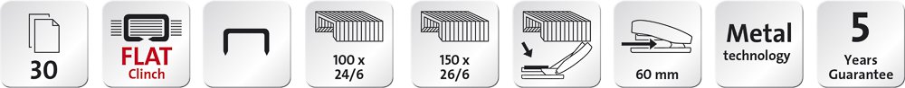 Cenově výhodná sešívačka s funkcí Flat Clinch - plochým sešíváním pro úsporu místa v pořadačích. Celokovová s plastovým opláštěním. Pevné ploché sešívání a sponkování. Plnění shora s jednoduchým vedením sponek. Max. hloubka vkládání papíru 60 mm. Kapacita: 100 kusů sponek 24/6, 150 kusů sponek 26/6 Super. Balení vč. 200 sponek 24/6 DIN SUPER. Prodloužená záruka: 5 let.