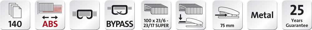 Cenově výhodná velkokapacitní sešívačka pro všechny větší úlohy. Anti blokovací systém (ABS) pro komfortní, bezporuchové sešívání. Celokovová s plastovým opláštěním. Variabilní hloubka vkládání. Expresní odstranění poruchy sešívání. Dvojité vedení sponek pro přesné sešívaní. Otočná matrice pro rychlé střídání paralelního a bypassového sešívání - bez nutnosti změny velikosti drátků. Prodloužená záruka: 25 let.