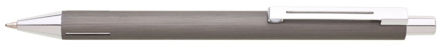 Elegantní hliníková propiska s jemně rýhovaným, šedým povrchem a stříbrnými doplňky.