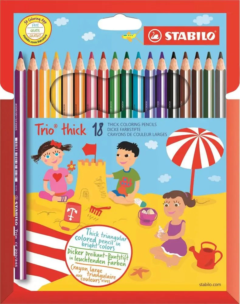 Trojhranné silné ergonomické pastelky, které se dobře drží v ruce. Šířka hrany 9 mm. Nelámavá tuha s vysokým obsahem kvalitních pigmentů, průměr tuhy 4,2 mm. V balení 18 barev.
