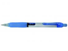 Gelový roler s gumovým úchopem, šedým plastovým tělem a průhlednou částí ukazující stav náplně. Barva gripu shodná s barvou náplně. Náplň Spoko 0292, šíře stopy 0,7 mm. Barva: modrá.