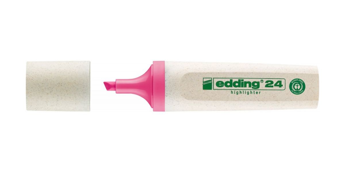 Zvýrazňovač Edding se seříznutým hrotem, šíře stopy 2 - 5 mm. Umělohmotné části vyrobeny minimálně ze 70 % z obnovitelné suroviny.