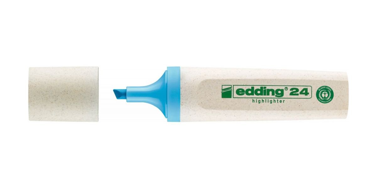 Zvýrazňovač Edding se seříznutým hrotem, šíře stopy 2 - 5 mm. Umělohmotné části vyrobeny minimálně ze 70 % z obnovitelné suroviny.
