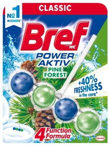 Bref WC blok Power Aktiv s vůní borovice zajišťuje komplexní péči o toaletu při každém spláchnutí. Čtyři účinné kuličky v průhledném nerozebíratelném košíku kombinují hygienickou čistotu, svěží vůni, ochranu proti usazeninám a bohatou pěnu pro lesk a bělost toalety.