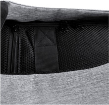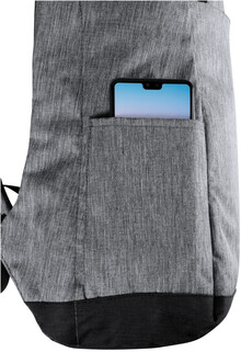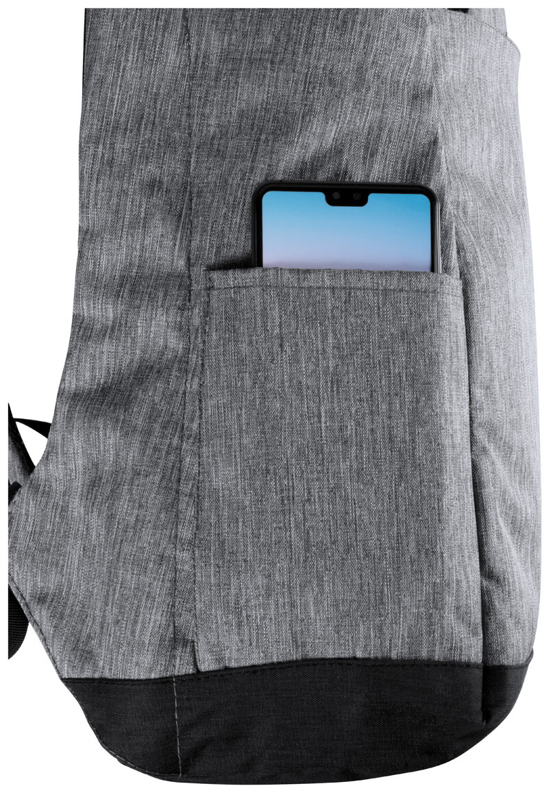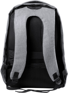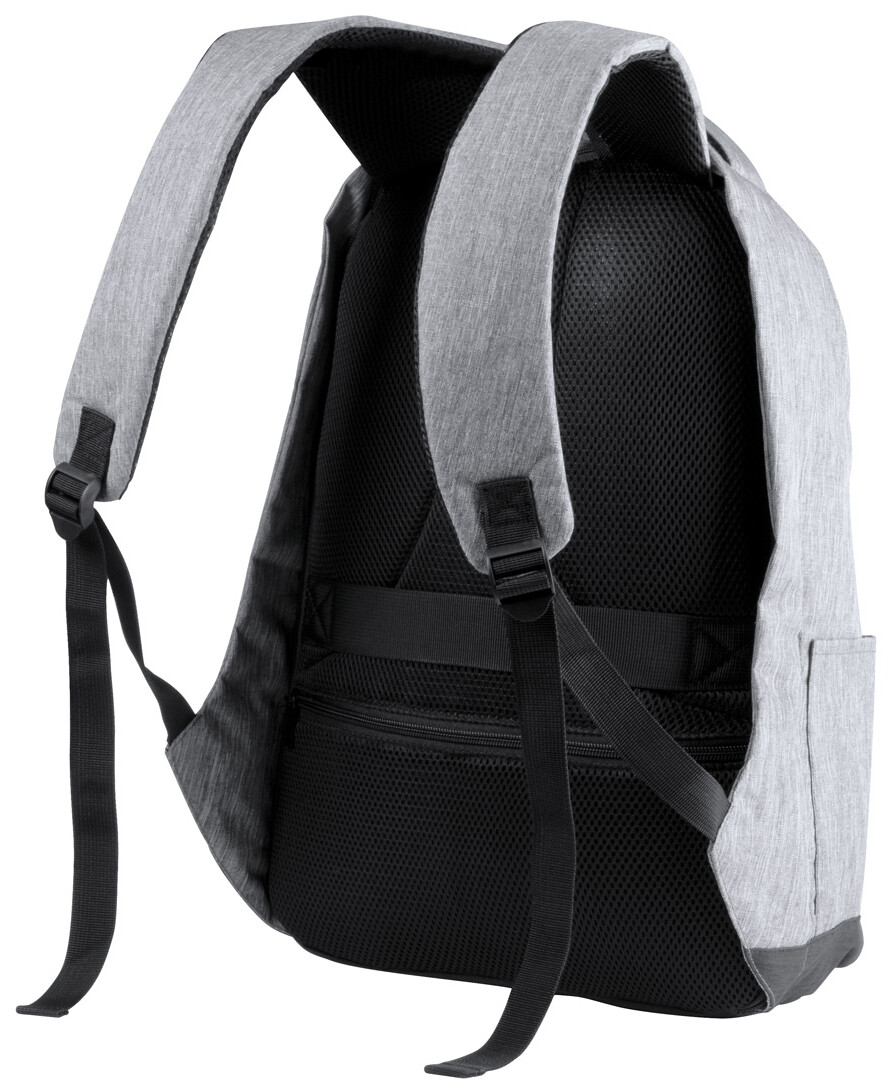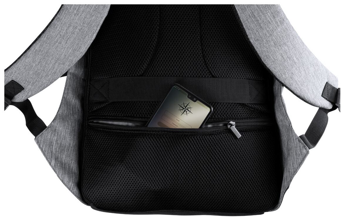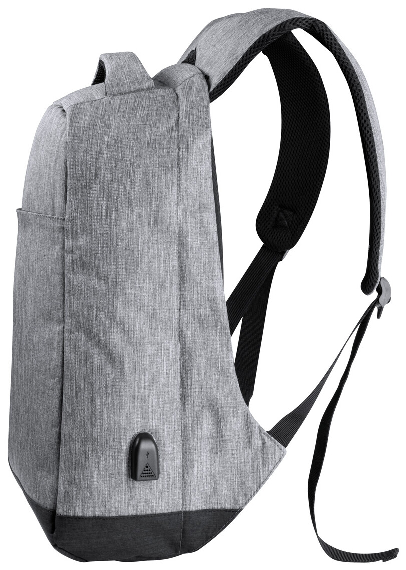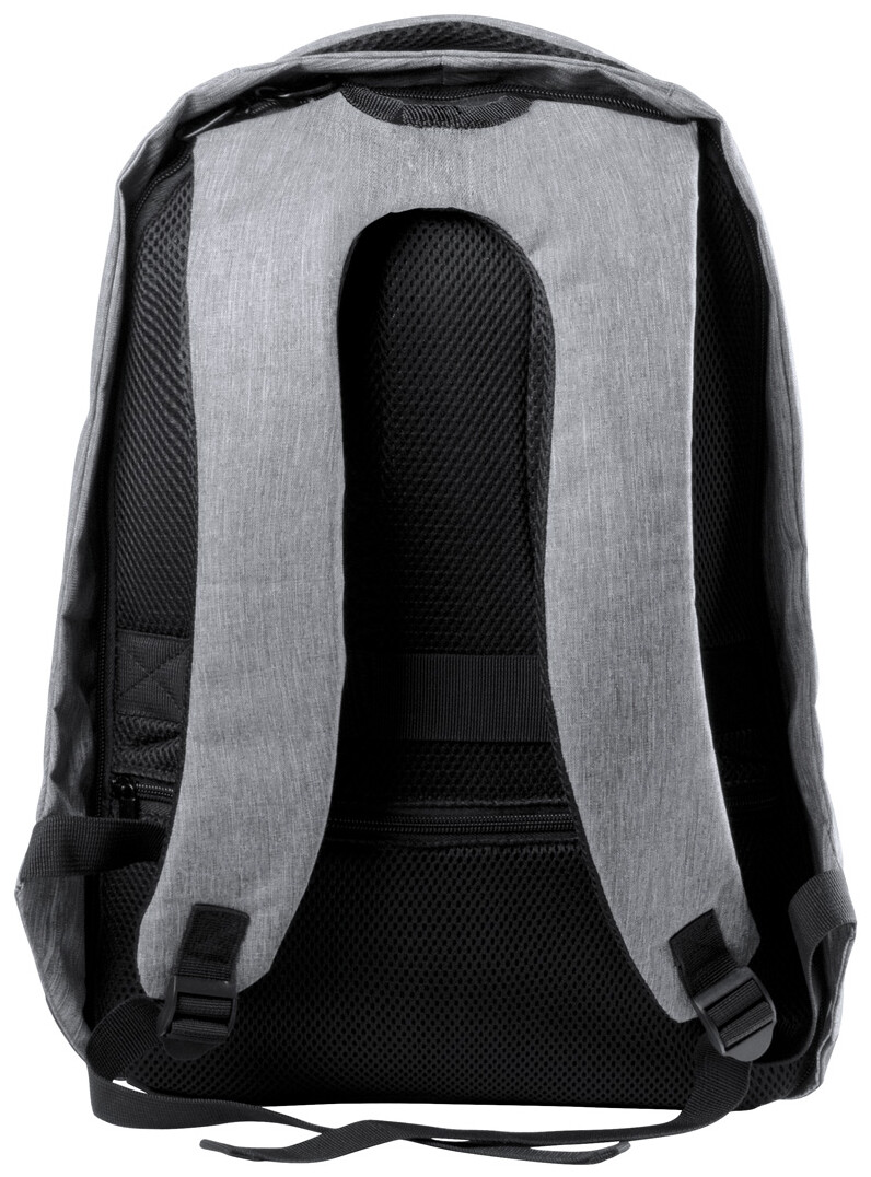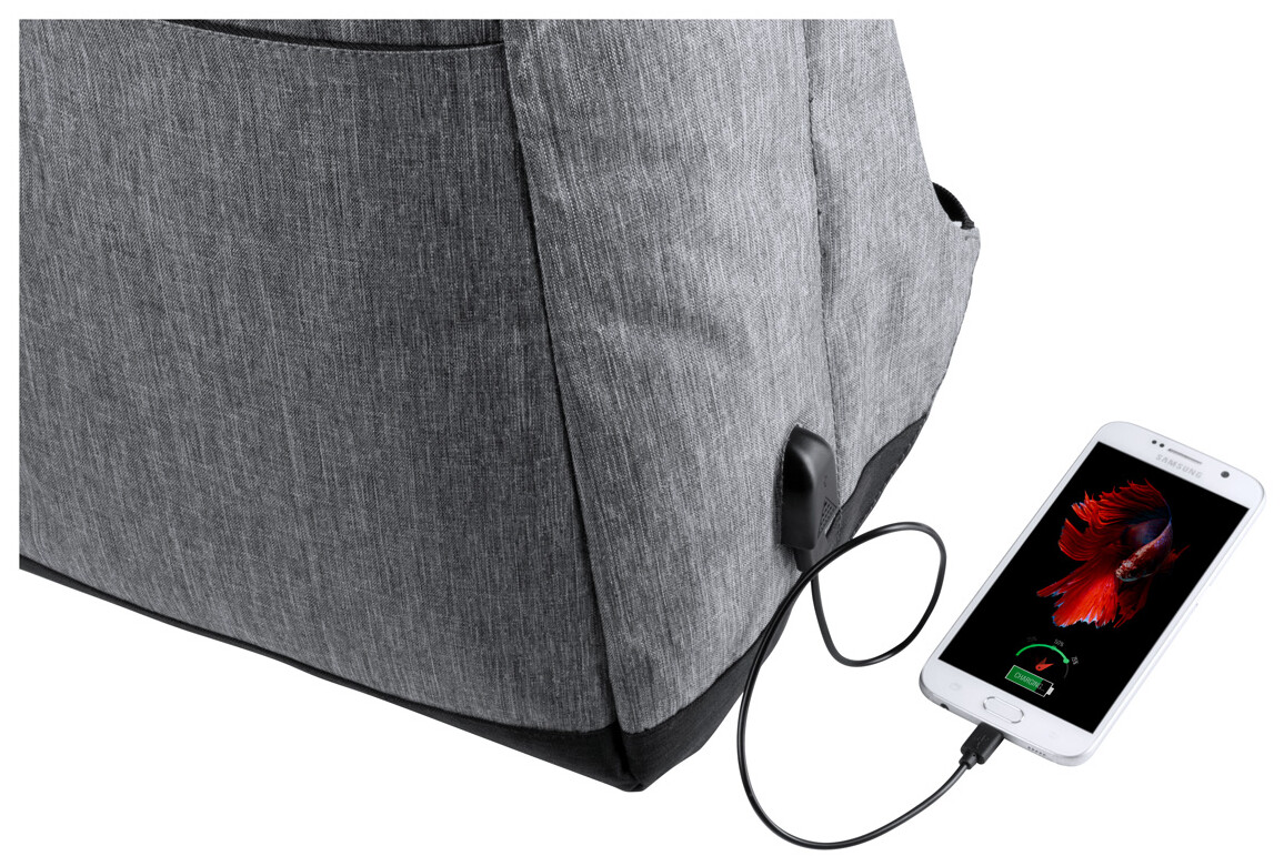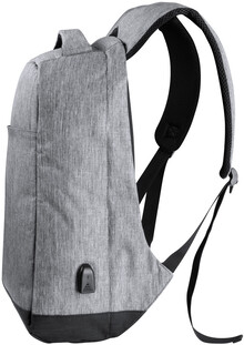 Voděodolný batoh s ochranou proti krádeži s několika přihrádkami na zip, polstrovaným prostorem pro laptop (15 ") a tabletem (12"), polstrovanými zády a ramenním popruhem. S vestavěným USB připojením pro power banky. 300D Polyester.