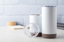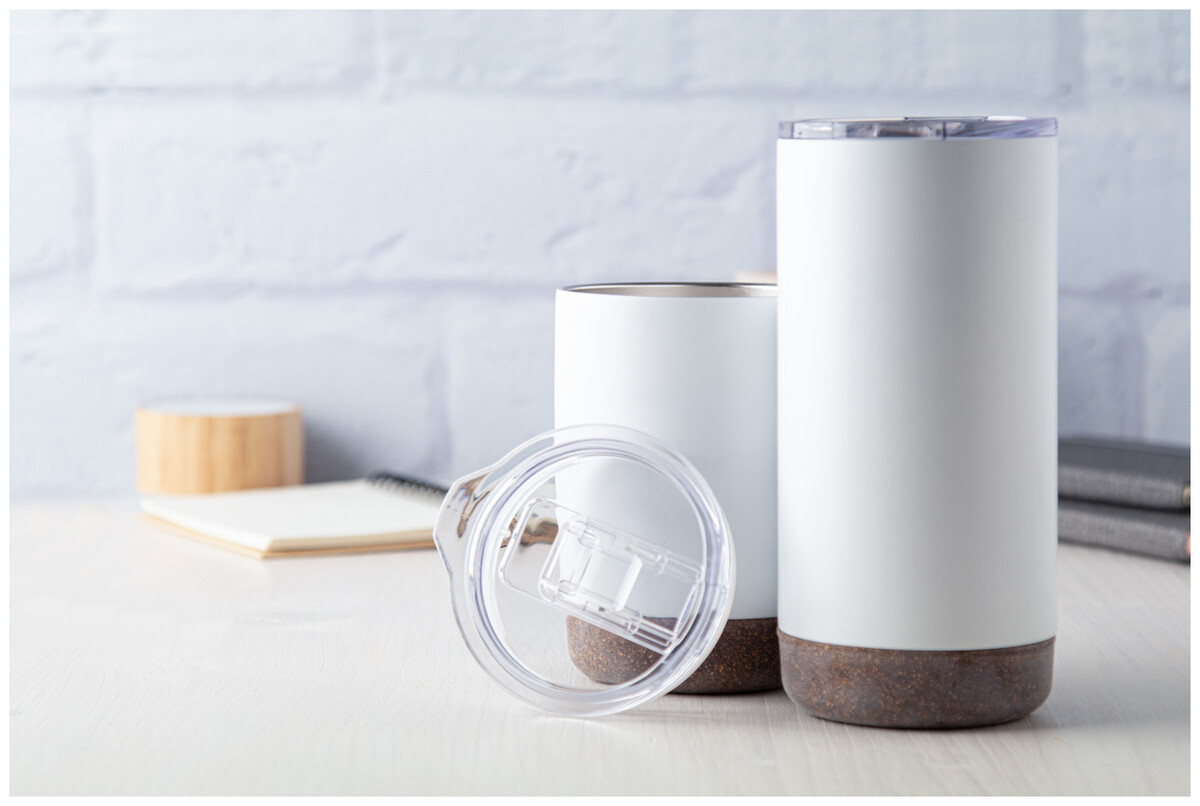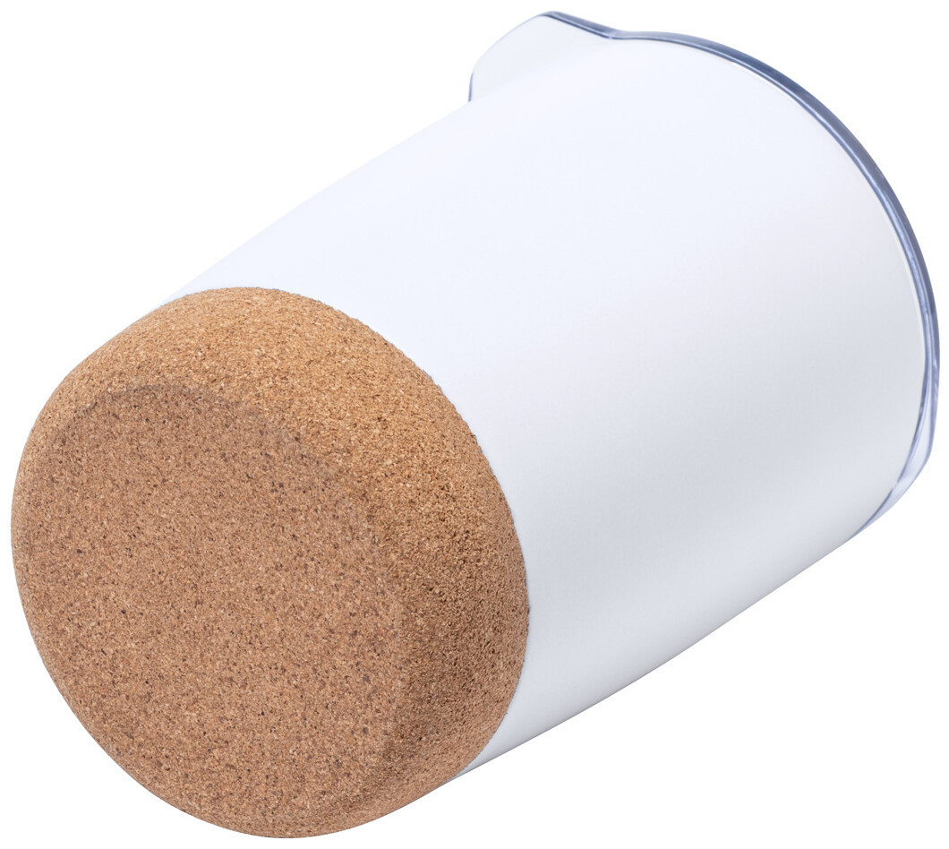 Dvoustěnný termo hrnek z nerezové oceli s průhledným víčkem na pití a korkovým dnem, 380 ml. V dárkové krabičce.