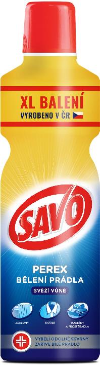SAVO Perex Svěží vůně je parfémovaný přípravek pro předpírání a bělení bílého a stálobarevného prádla v automatických pračkách, ale i pro ruční bělení. Účinně odstraní skvrny již ve fázi předpírky. Je mimořádně účinný při bělení polyesterových a bavlněných záclon.